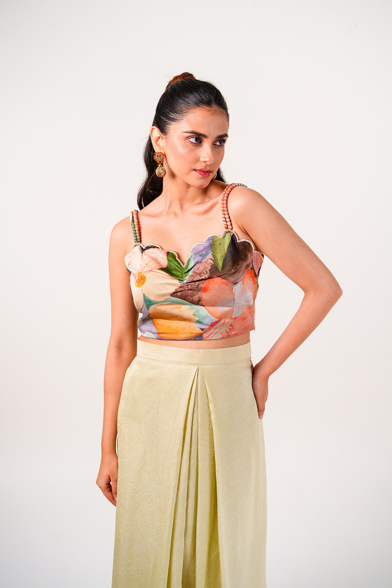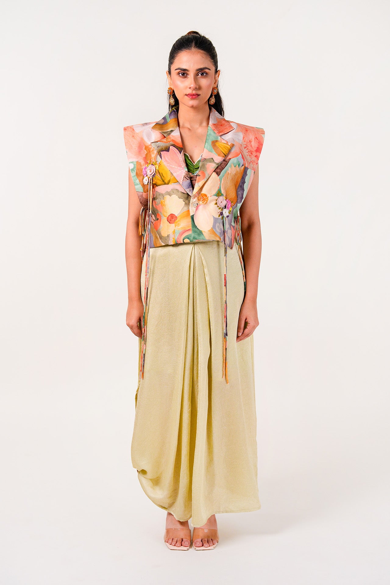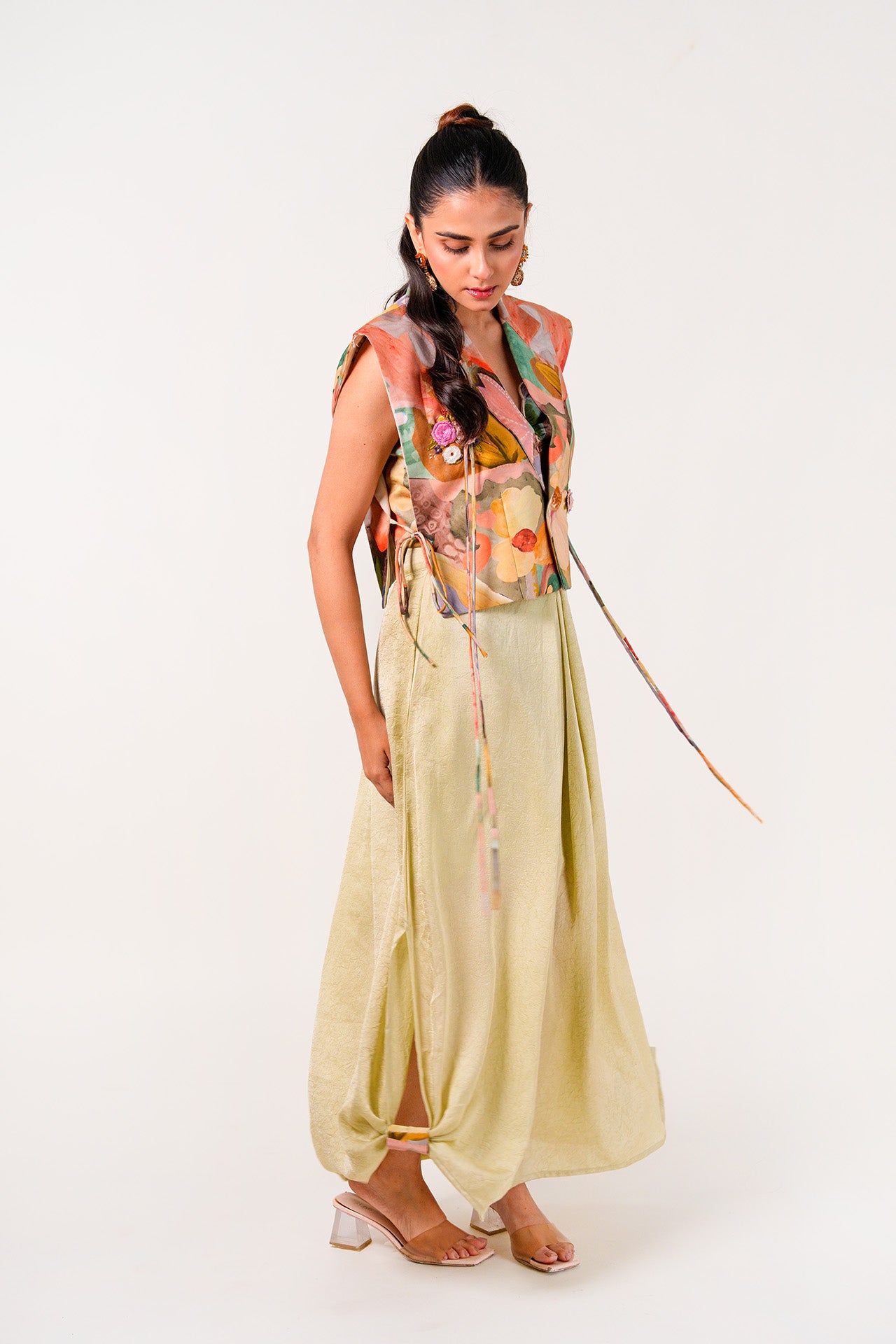 A statement coord set featuring a structured printed crop vest with sharp shoulders, lapel collar, and handcrafted floral embellishments on the front. Adjustable side tie-ups add shape and detail to the silhouette. A same print crop top inside with a scalloped neckline and delicate beaded shoulder straps.It is paired with a fluid sage-green skirt featuring soft draping and a gathered side slit detail.