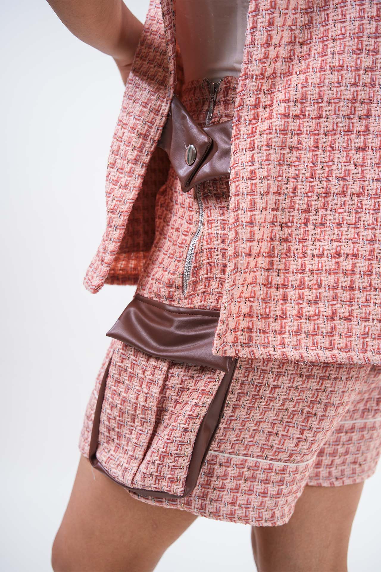 High Waist Shorts with Tweed-Leather Pocket Detailing