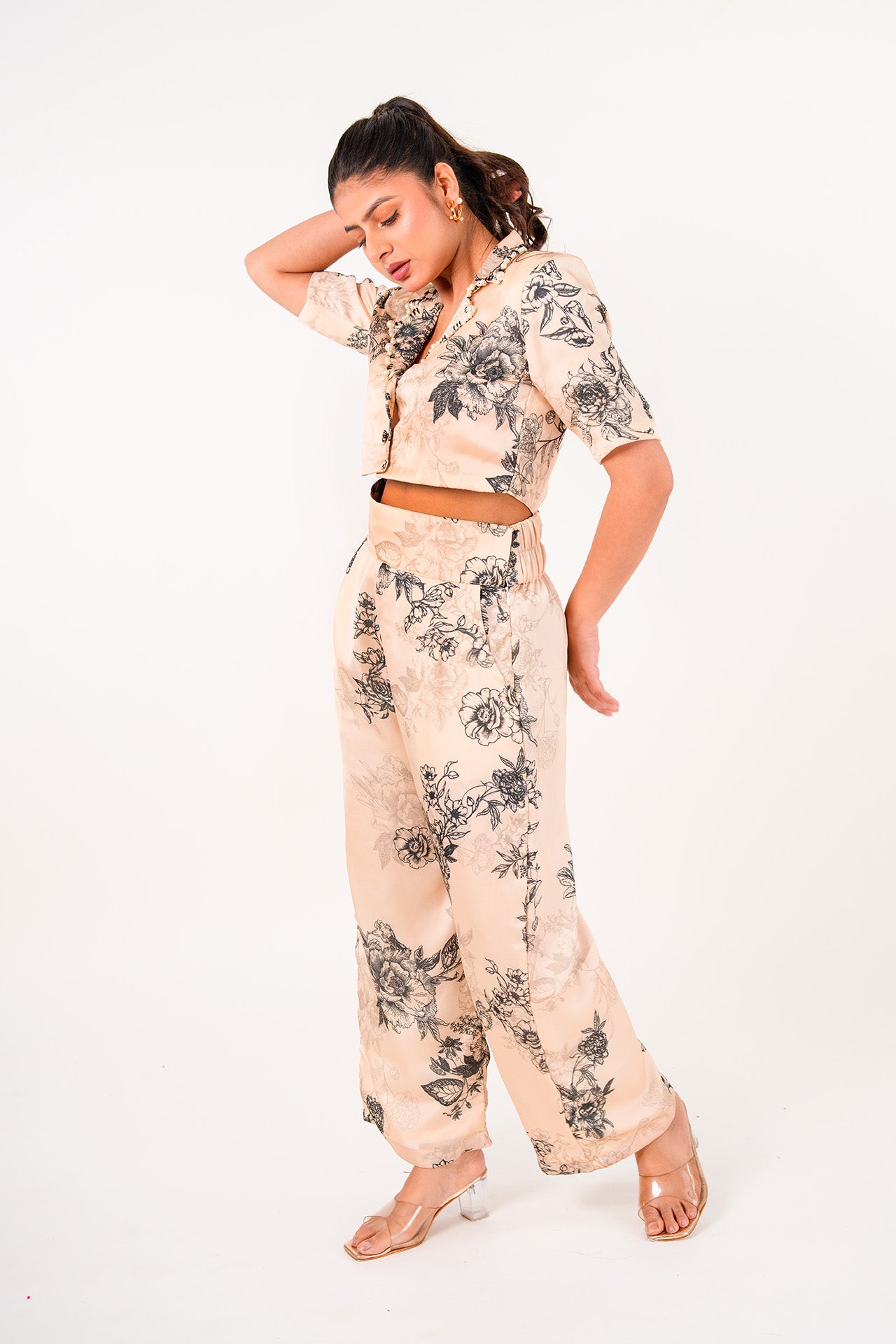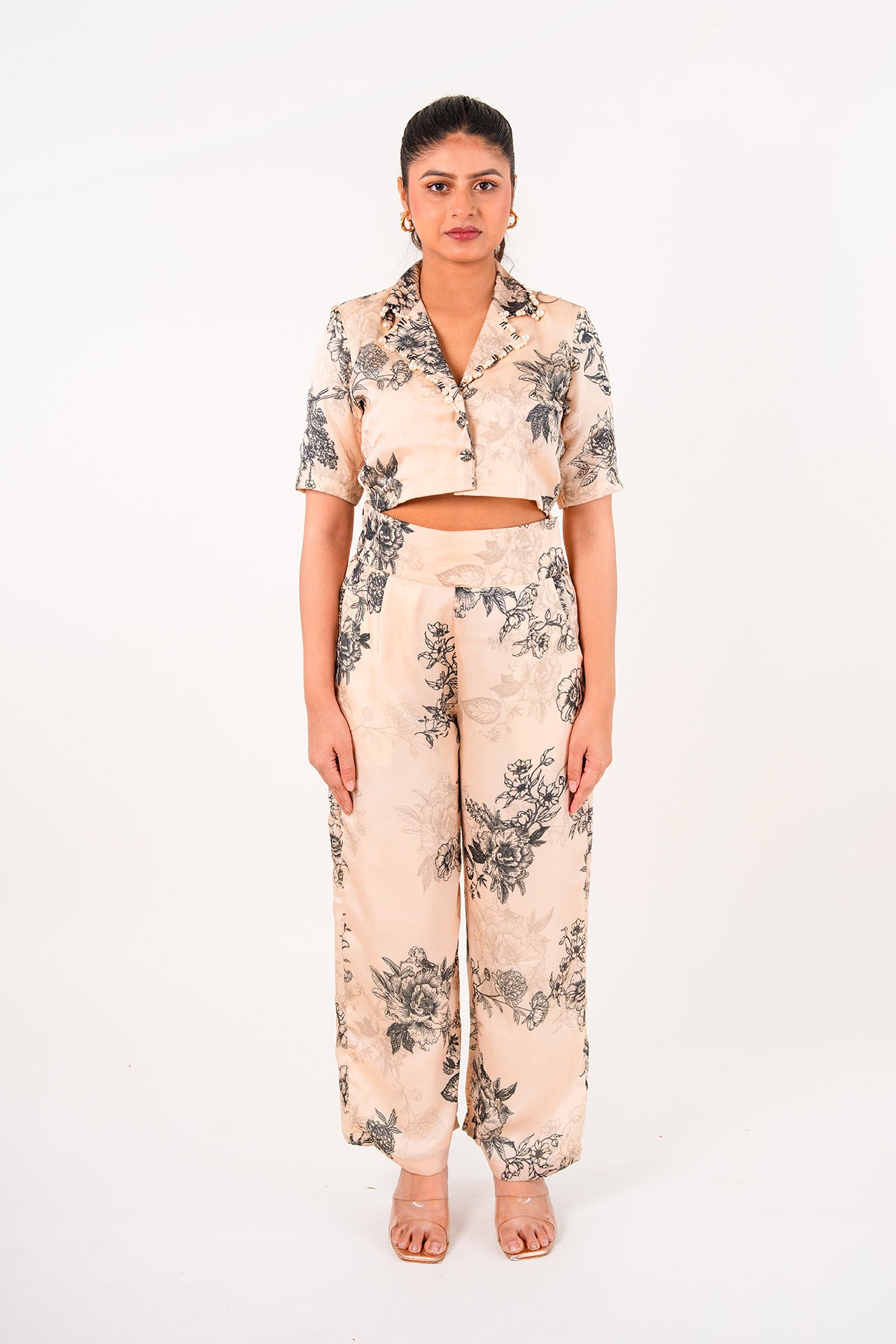 A printed coord set featuring a structured cropped jacket with shoulder pads, short sleeves, and a monochrome floral print. The collar is accented with delicate pearl and stitch-line detailing, adding a refined touch. It’s paired with high-waisted wide-leg trousers.